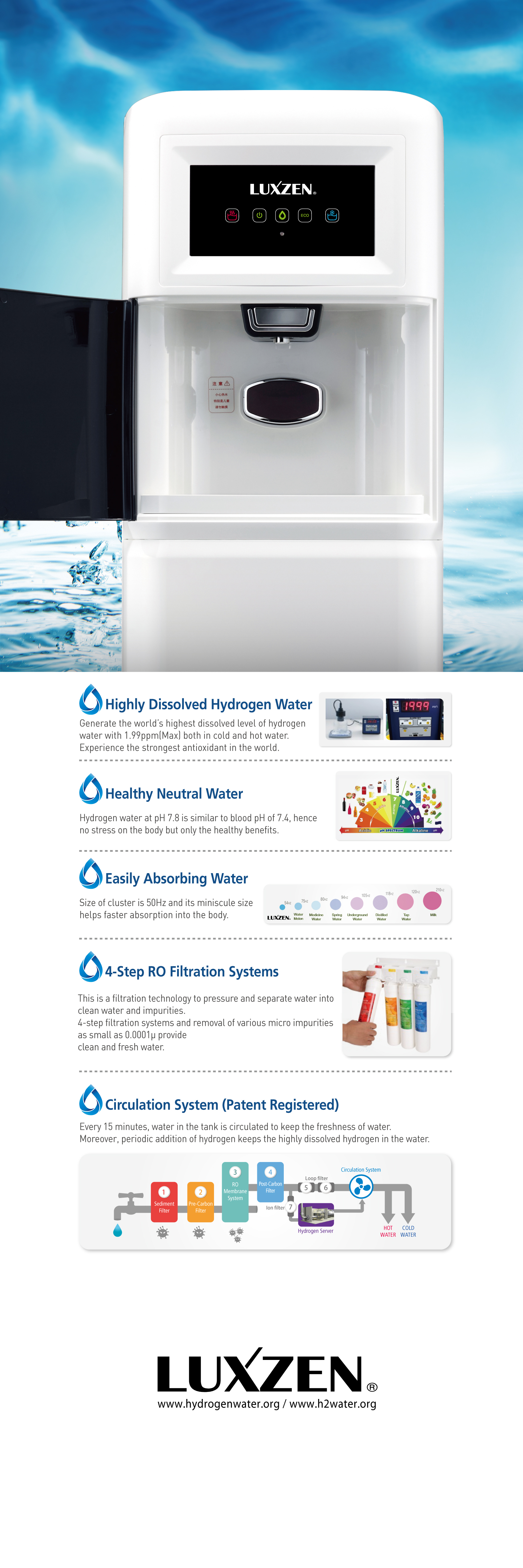 - It circulates water in the water tank for 15 minutes per hour through a proprietarily developed circulation system, and replenishes the hydrogen to keep the water fresh and able to supply highly concentrated hydrogen water.