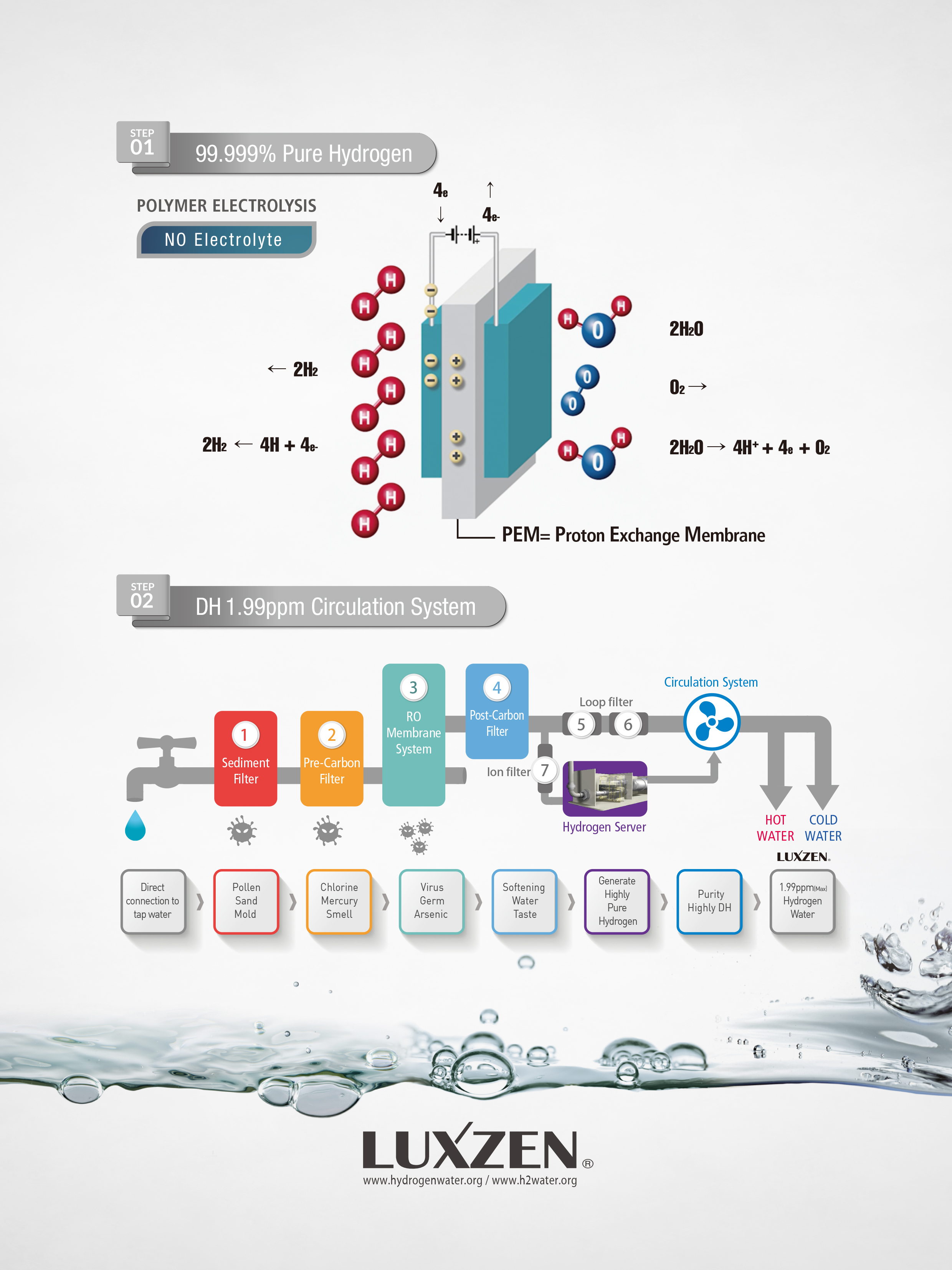 - Generally, the concentration of hydrogen is decreased in hot water, but our water purifier keeps the hydrogen concentration close to the world's highest levels, even in hot water.