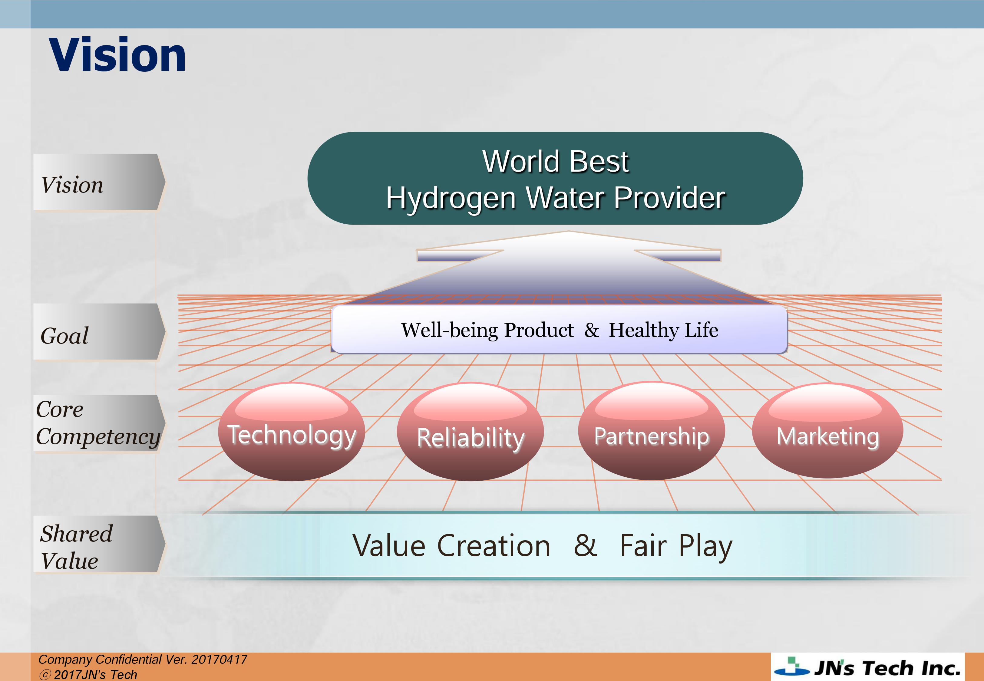 Since its inception, JN's Tech has designated water, air, and light as our business scope and has been developing living and home appliances that are essential to ourhealth and eco-friendly lives. We are specialists in environmentally friendly living and health. Our company has reaped continuous success backed by customer support. We have acquired patents for hydrogen water technologies to remove free-radicals, developed hydrogen water purifiers, strengthened our lineup for living and environmental appliances such as high quality bidets and personal oxygen generators, and developed and sold Luxzen interior lighting. Now, together with our customers, JN’s Tech is beginning to take the second leap forward, building upon the achievements we have made so far. We established a R&D center, the H&O Science Forum, in 2006 to expand our eco-friendly business and to reinvent our designs. We do our best to reach out to our customers through diversifying our sales channels. In 2012, we started exporting the world’s best second generation hydrogen water purifier to Japan. We entered to the Chineae market from 2015 and completed test marketing to enter the U.S.A market. We strive to become a global well-being company through diversification of market/partners. In addition, we have renewed our vision as a “Specialized hydrogen water provider” that provides the world’s best hydrogen water.