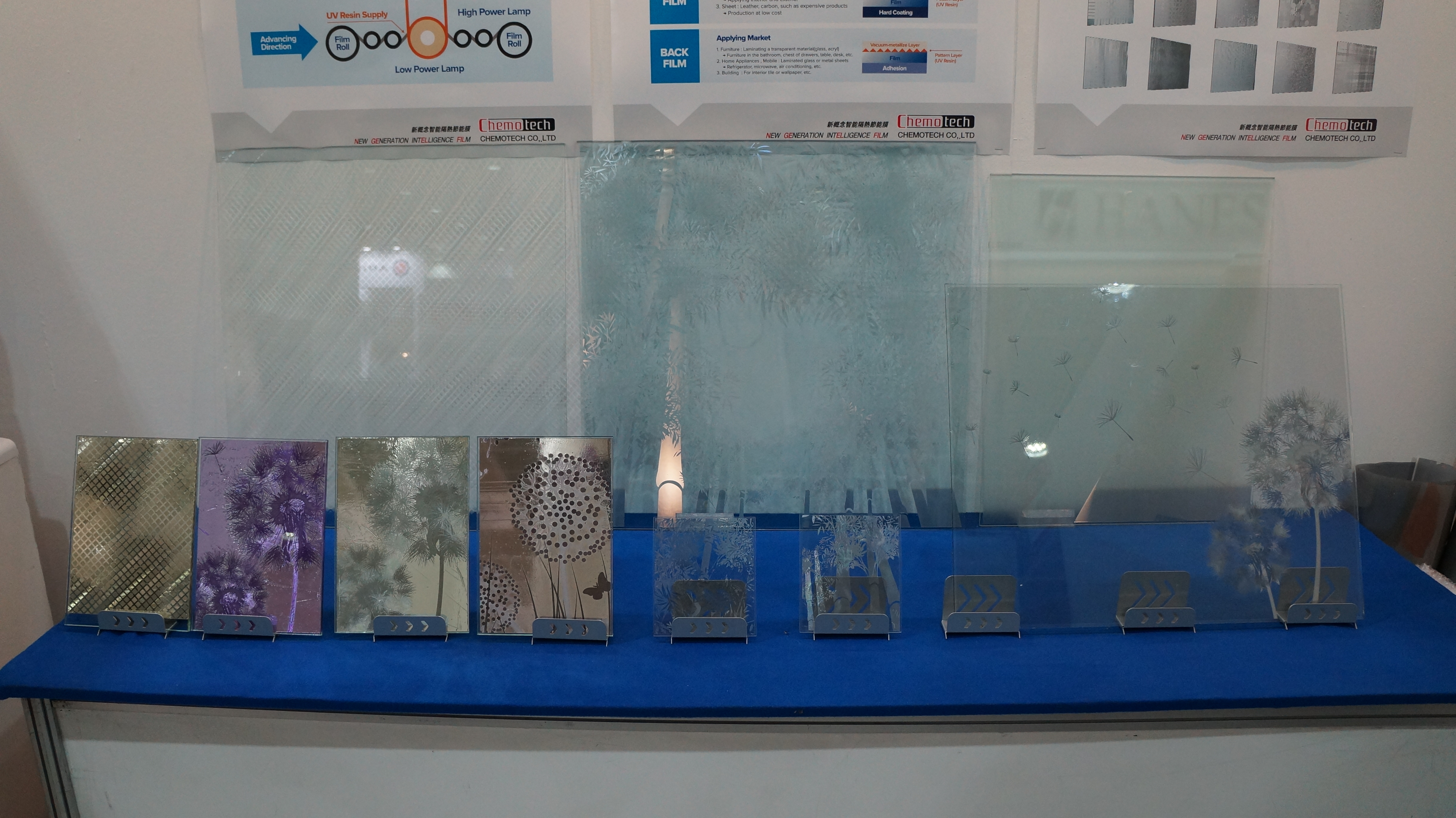 Chemo TEch N.GEL® 3D Nano-pattern film is a window film for architectural and interior use that has the function of protecting privacy of individuals and allows one to decorate interior design by processing 3D Nano patterns on existing heat blocking films. The heat blocking function cuts off the infrared heat ray coming from the sunlight and increases the transmission of visible light, so that it can secure a clear view in the room, maintain a comfortable indoor temperature, and reduce the air conditioning and heating. Our heat blocking film has the highest visible light transmittance of 70% and infrared ray cut off rate of 95%. 3D Nano pattern has a three dimensional pattern like a hologram on the heat blocking film and various printing designs can be applied on the film while customizing the size, pattern, and color to the taste of the user. Compared to existing heat block films, it can be widely applied and has an excellent aesthetic effect.