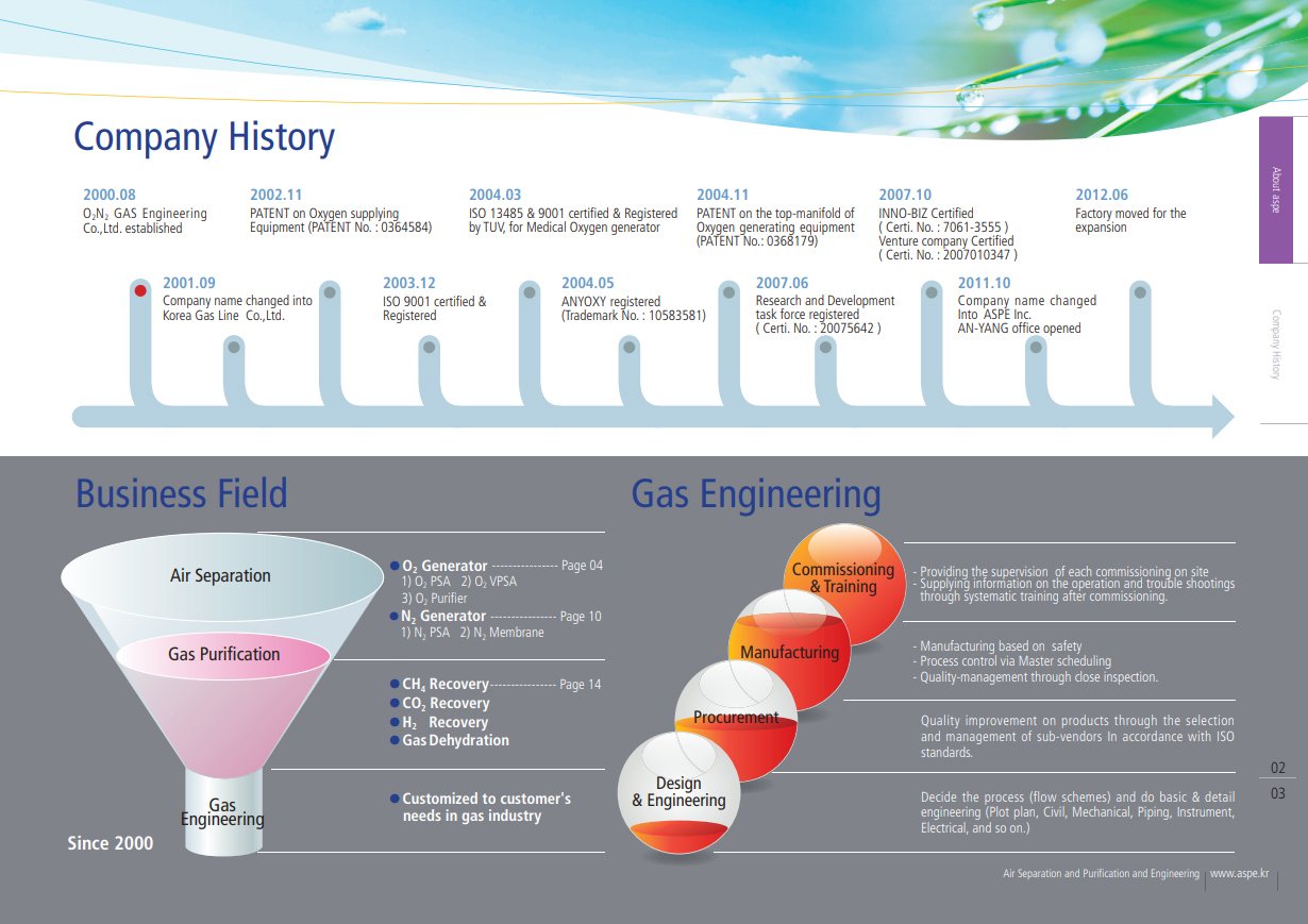Welcome ! Welcome to our e-catalog home. Here you can find information about our products. You can also send us inquiries and post comments about our company and products. We hope you enjoy your visit. Aspe Inc. is installed based on air separation and gas purification technology. It is a gas engineering company that has grown by operating a package until a test run. Our ASPE is a company that stably increases sales by possessing the world's best technology so as not to be shaken by any changes in the economic environment. By actively discovering and nurturing new growth engines through global marketing, we will develop into a company with the highest value.